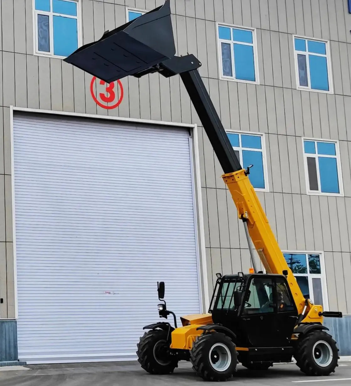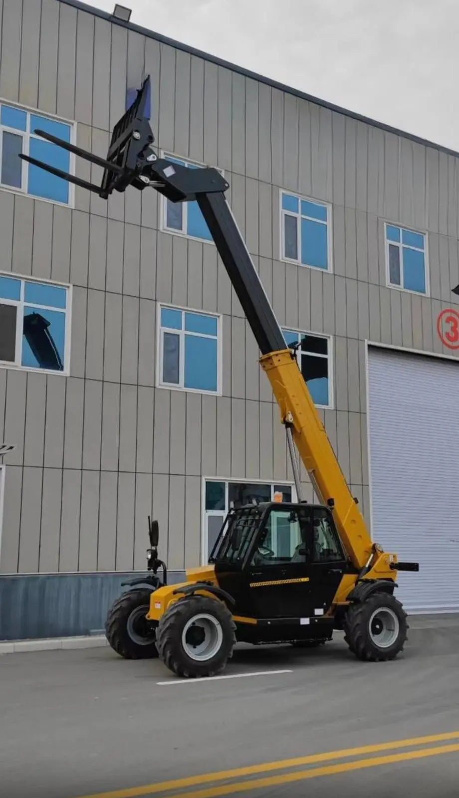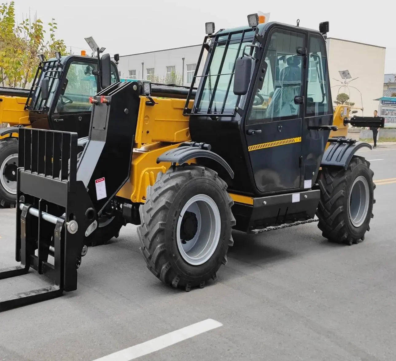 – Chariot télescopique (23 pieds) : charge utile de 3,5 tonnes, moteur Cummins EPA Tier-4 de 55 kW, cabine de luxe avec climatisation, direction à 4 roues, fourche flottante de 1 220 mm, système d'avertissement de surcharge