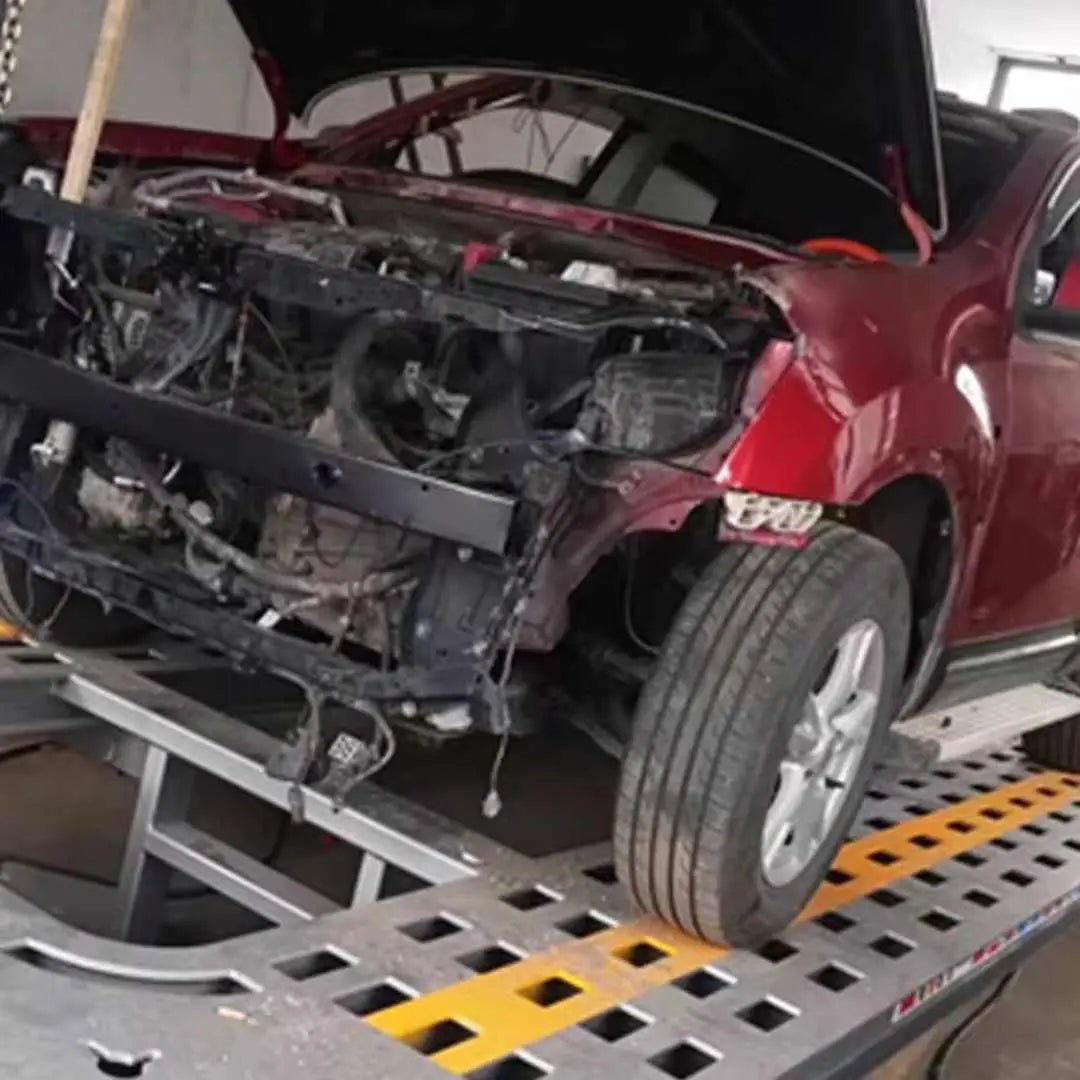 Conçu pour les véhicules à châssis complet/monocoque Pont inclinable avec capacité de levage de 3 500 kg (7 700 lb) Pince d'ancrage universelle à hauteurs réglables Finition de surface avec revêtement en poudre durable Deux tours avec système hydraulique de 10 tonnes L'armoire de commande électrique contrôle les tours et le pont Tableau d'outils complet
